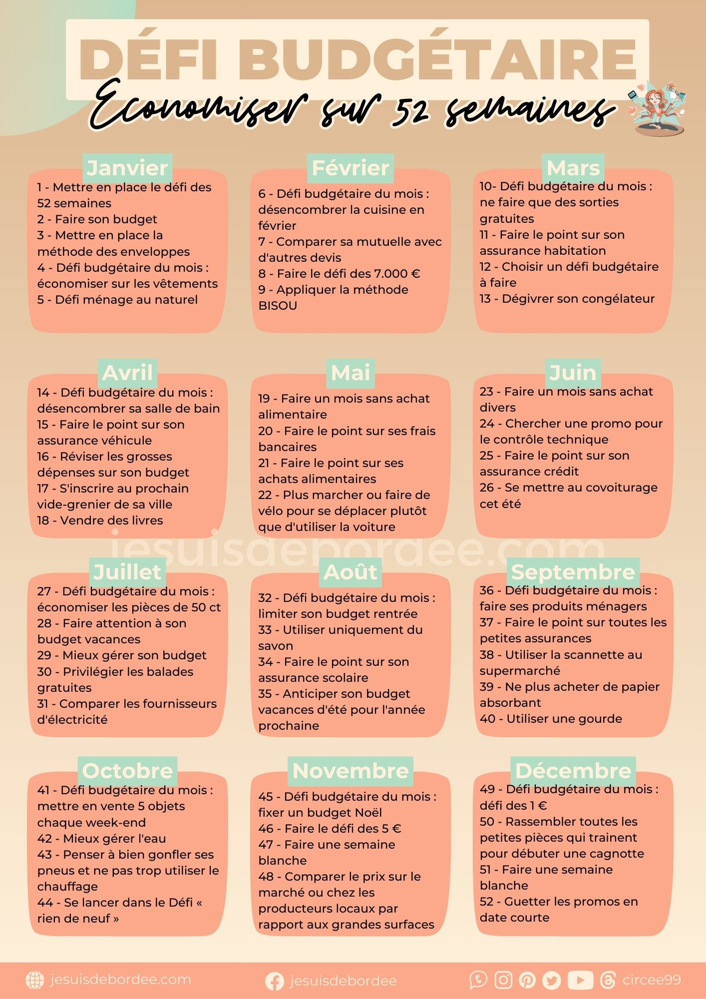 - Les défis budgétaires : choisis toi un défi budgétaire à faire pour le reste de l’année ou juste un mois, histoire de booster tes économies.